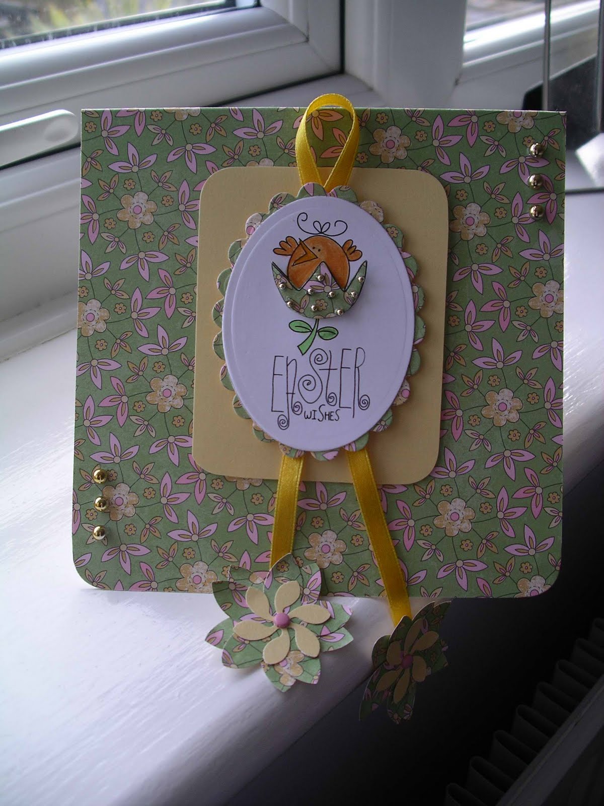 I started the Creative Craft World Easter challenge and then realised that there were no choccy eggs in the house only real lovely local free range ones. So here's my Easter basket with real chickens eggs. The card is meant to sit on the edge of a shelf with the flowers dangling down.